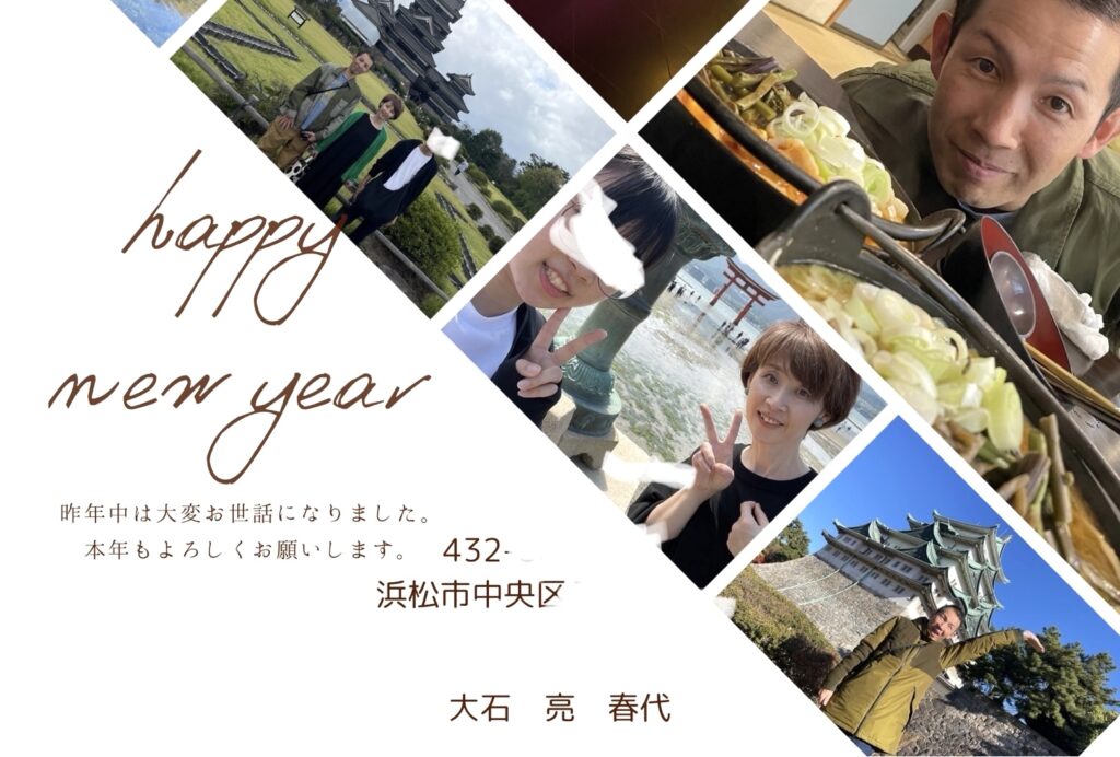 これが今年の大石家の年賀状です。陽気なオジサンが三か所も映っています。そして家族全員が載るようにしています。子供が思春期でも何とかして毎年載せていました。そして余白のスペースにメッセージを書きます。